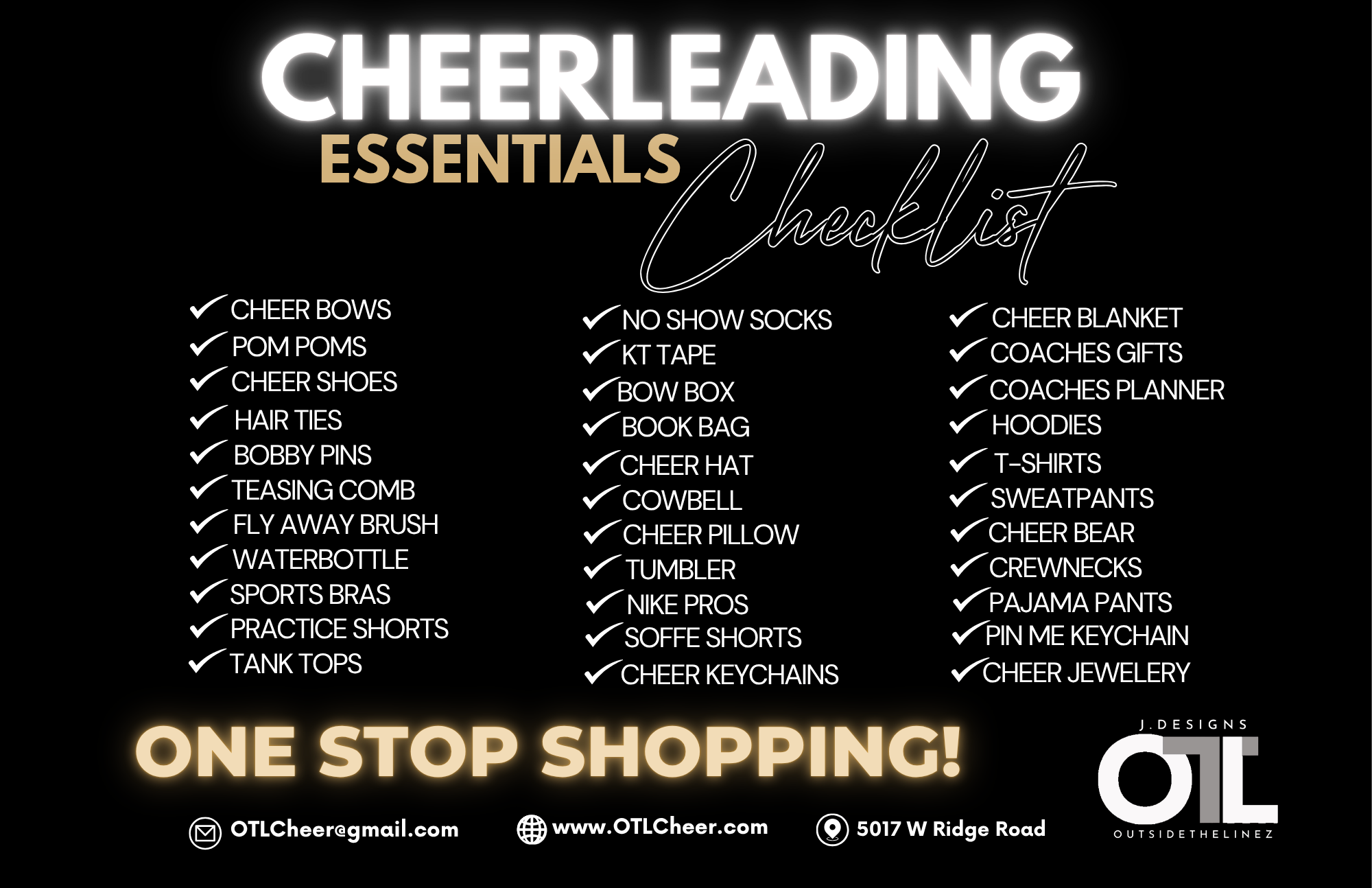 Calling all coaches, athletes, and cheer parents — we're your one-stop shop for all things cheer! From performance-ready practice wear and top-quality cheer shoes to glittery accessories and game-day essentials, our high-energy storefront has everything your cheerleader needs. Whether you're just starting out or heading to nationals, we've got the gear to help you cheer loud, jump high, and shine bright! Visit our OTL storefront at 5017 W Ridge Road in Rochester, NY.
